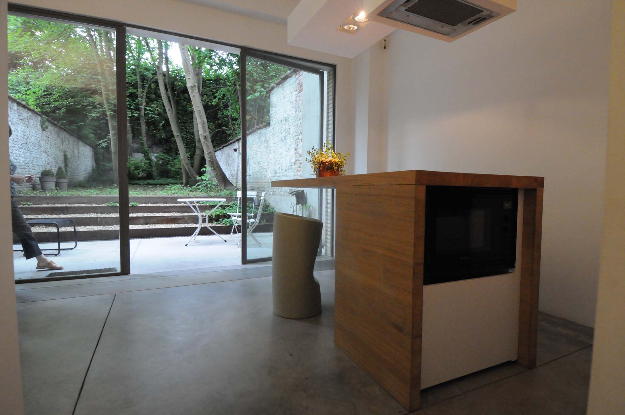 Une large baie vitrée en profils acier effilés rappelle l’architecture des années 50. Elle encadre une vue qui évoque les aquarelles du symboliste belge Léon Spilliaert (1881-1946) par la présence impassible des hêtres soulignée d’une succession de gradins en acier auto-patinable.