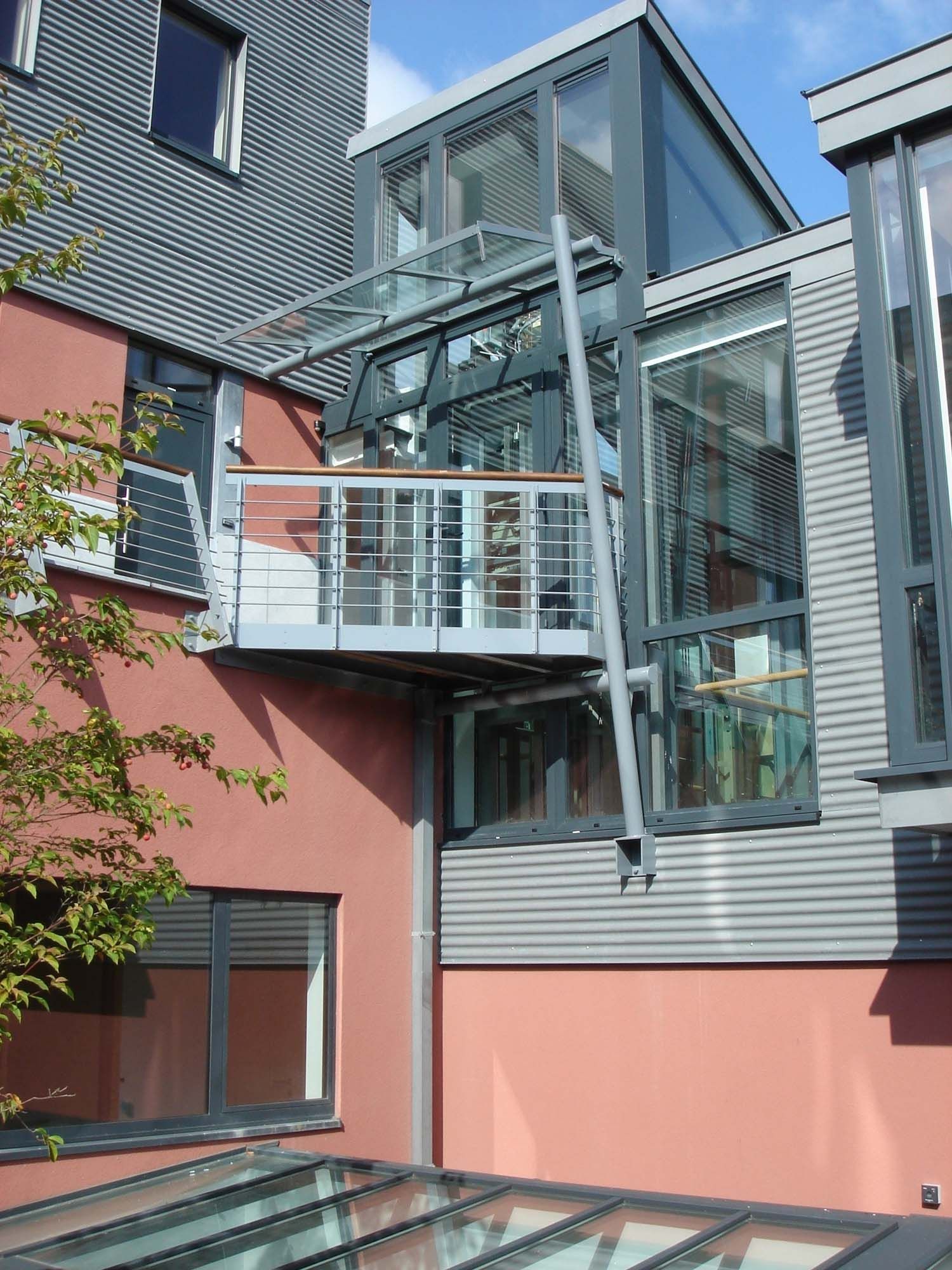 Le nouveau programme consistait à créer un petit centre d’affaires. La commune souhaitait également adjoindre des logements. Les appartements sont pourvus de deux terrasses en caillebotis. La coursive extérieure (en intérieur d’îlot) donne accès aux appartements via un ascenseur entouré de parois vitrées. Les échelles de sortie de secours ont également été réalisées en acier. La structure de l’escalier est réalisée par des plats métalliques qui enserrent des panneaux de verre servant de garde-corps. Celle de l’ascenseur est réalisée par des tubes d’acier de section 8 x 8 cm. La gaine de l’ascenseur est entièrement vitrée. Les panneaux de verre sont retenus par de petites cornières métalliques. L’ascenseur est lui-même entièrement vitré. L’utilisation de l’acier a permis de réduire au strict minimum la section des éléments porteurs, de garder une transparence totale du hall et ainsi de lui donner cette fonction noble d’accueil. L’acier utilisé est de type A30F, celui-ci a subi une métallisation à chaud et est recouvert de trois couches de peinture RM (peinture époxy à deux composants). Les caillebotis des terrasses sont galvanisés à chaud.