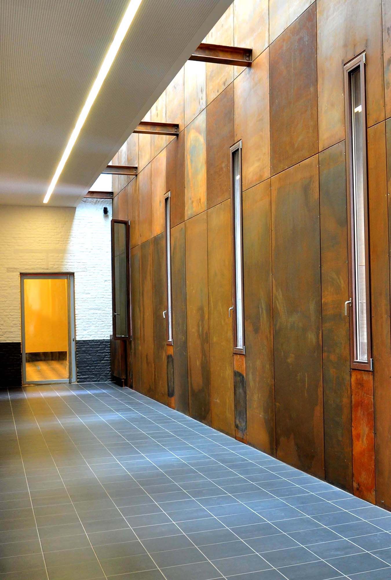 Avec la restauration du patrimoine historique, la réorganisation interne et l’optimisation de la circulation à l’intérieur de l’école Emile Braun peuvent être considérées comme faisant partie des principaux défis de ce projet. Pour la reconstruction du cloître disparu, une structure faite de profilés creux en acier a été élevée suivant le rythme des fermes en bois de la toiture encore en place. Une seconde structure d’appoint pour la fixation de la façade a été rajoutée à la construction principale, interprétation contemporaine de la gallerie d’arcades traditionnellle. À hauteur des étages supérieurs, la façade a été habillée d’un bardage en acier autopatinable. Le jeu de lignes dynamique des différentes surfaces se raccorde aux larmiers des façades adjacentes.