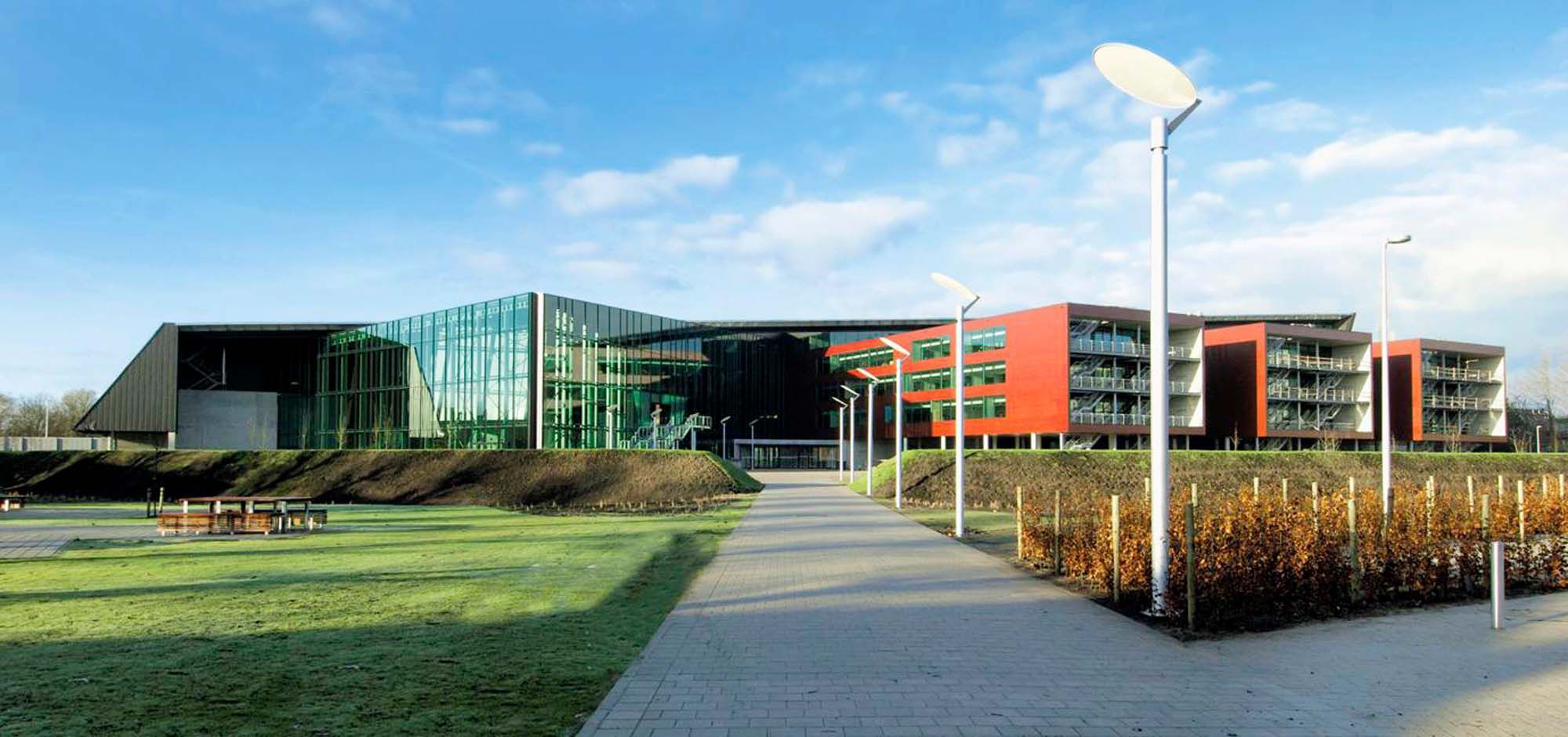 Le complexe du nouveau campus à Bruges est recouvert d’une toiture en acier monumentale qui se transforme, le long de la voie rapide, en façade avec bardage en zinc de couleur anthracite. La structure du toit est en acier afin de pouvoir franchir de grandes portées au moyen d’une construction légère. Les fermes en acier - structure en treillis - sont portées par des colonnes en béton assurant la stabilité nécessaire. La structure en acier dans son ensemble mesure 169 m de long, 50 m de large, 24 m de haut et pèse 598 tonnes. Dans la grande cage d’escalier, les poutrelles de toiture et les colonnes font office d’arêtiers, accentuant ainsi la finesse et l’ouverture de ce campus. Cette sensation d’ouverture se retrouve dans la cafétéria, où des arêtiers sont aussi utilisés. Tout le long de l’arrière du bâtiment se trouve un auvent élancé.