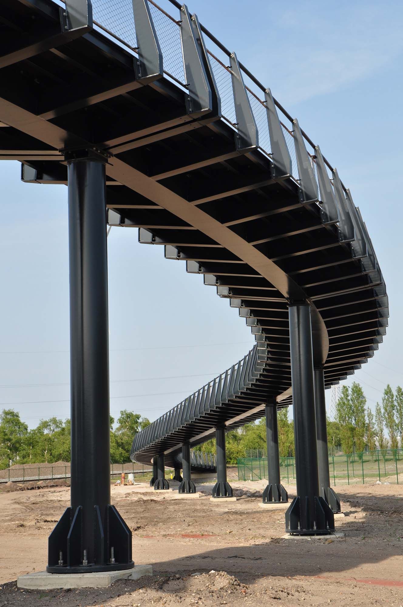 La passerelle est supportée par un profilé creux de 350 x 480 mm en forme de tire-bouchon. Ce caisson est aussi incliné d’un côté pour assurer l’évacuation de l’eau. Il est soutenu par des colonnes en acier faites de tubes ronds d’un diamètre de 508/16. Le tablier est supporté par un réseau de profils IPE 140 et de poutrelles assemblées en cône d’une hauteur allant de 480 mm à 240 mm. Le garde-corps est constitué de tôles de 10 et 15 mm. Enfin, sur ces montants sont fixés des cadres en inox avec un filet en inox.