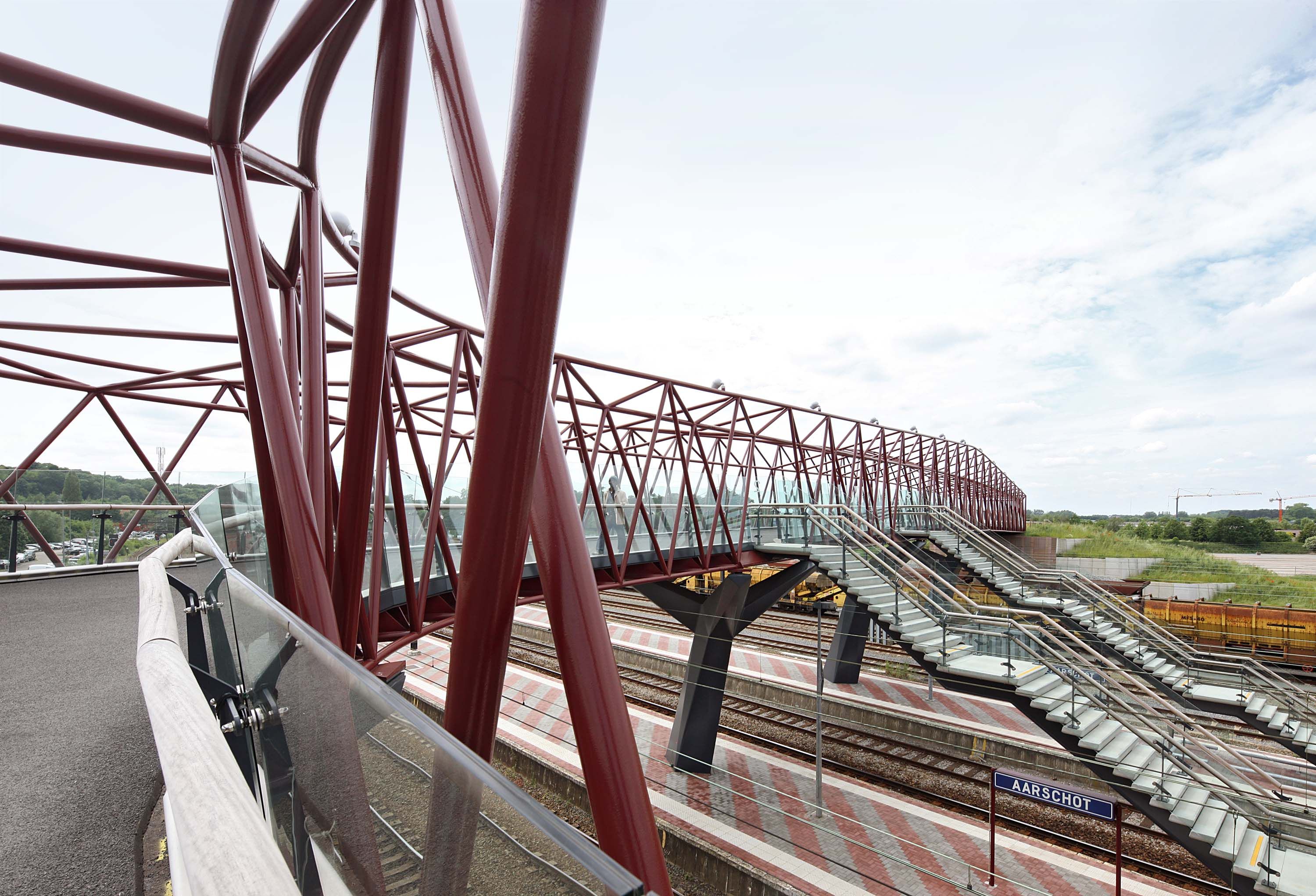 La passerelle pour piétons et cyclistes surplombant les voies à Aarschot relie la vieille ville à la nou-velle ville, séparées par le chemin de fer. En même temps, la passerelle offre de nouveaux accès aux voies, ce qui permet aux voyageurs de se déplacer de manière plus sûre et plus agréable vers les quais ou la gare.