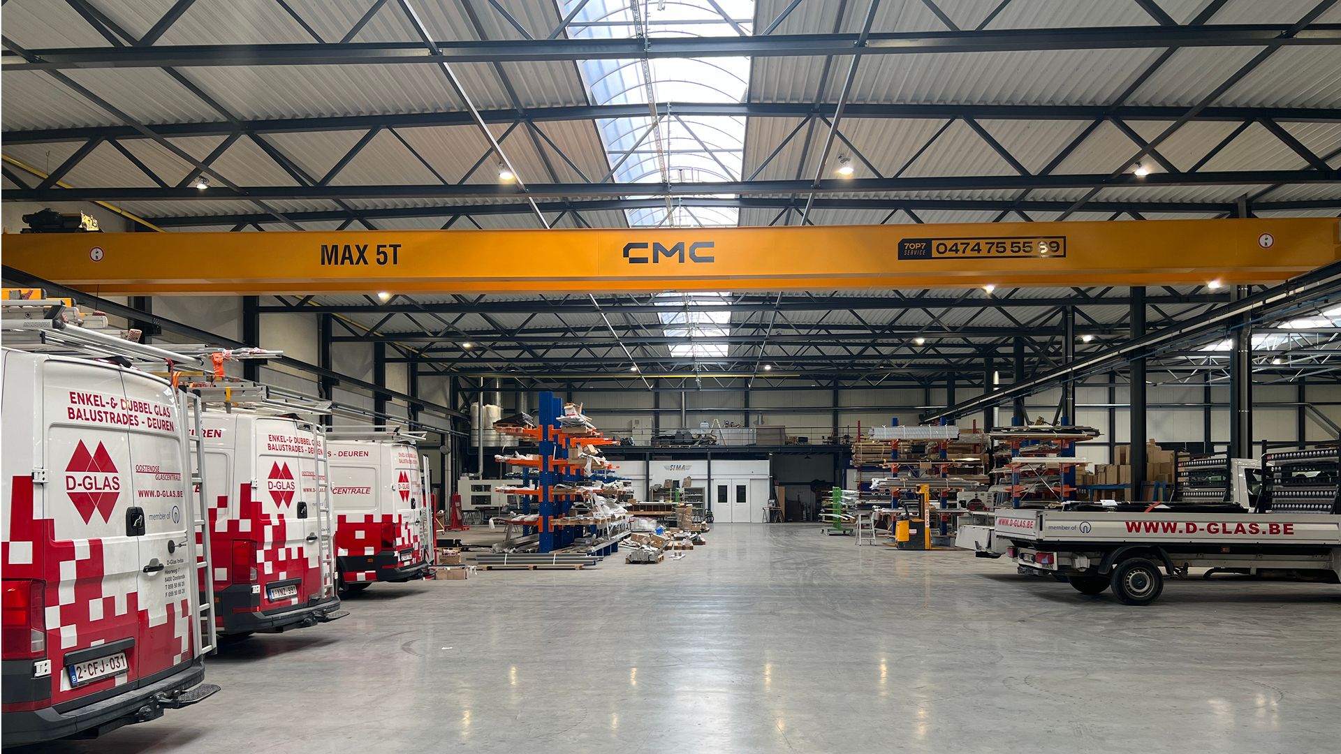 D-Glas, une entreprise de vente au détail et en gros située à Ostende, avait besoin d'agrandir son site existant avec 3 nouveaux halls de production de 2300 m² chacun. Il était demandé d'être aussi uniforme que possible, comme en témoigne le modèle fixe de colonnes et de fermes en acier. Il en résulte un hall industriel sans fioritures, avec un maximum d'espace disponible au sol (pour les grandes machines) et des passages libres.