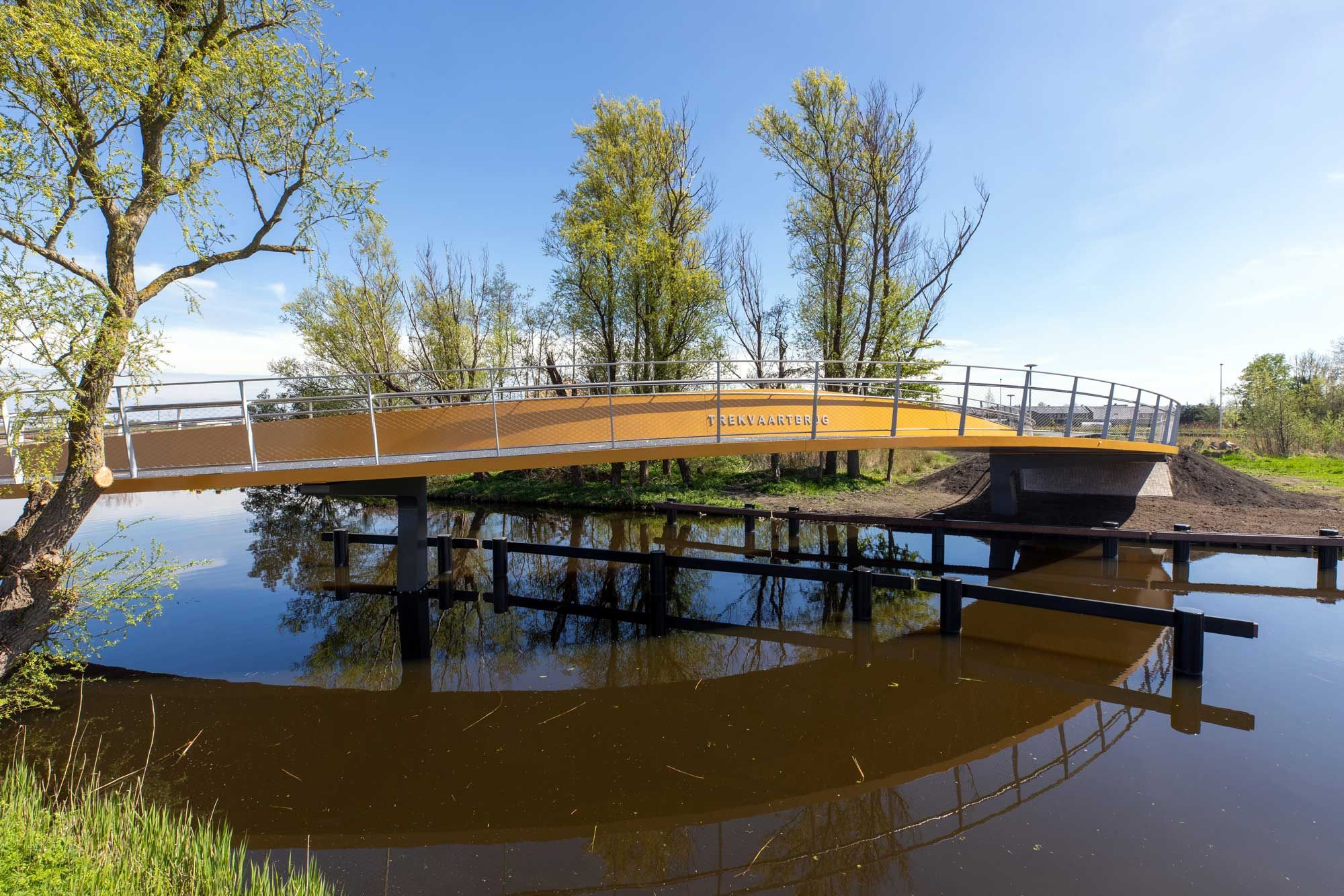 Ce pont cyclable asymétrique avec caisson de torsion porteur et tablier en porte-à-faux attire discrètement le regard dans le paysage de polders entre Voorhout et Noordwijk auprès de Leiden (Hollande du Sud). Le pont décrit une courbe prononcée, encadrée à l'intérieur par le caisson de torsion qui s'élève au-dessus du tablier. Les points d'appui intermédiaires sont situés directement sous le caisson de torsion, à l'endroit où les efforts sont les plus importants. La conception structurelle réduit au minimum la différence de hauteur pour les cyclistes, ce qui contribue au confort d'utilisation. Les deux approches diffèrent à presque tous les égards : un remblai d'un côté et une construction dans l'eau de l'autre. C'est là que commence le pont avec une partie plate, qui offre aux cyclistes qui montent de l'espace pour prendre leur élan et à ceux qui descendent de l'espace pour surveiller la route transversale et s'arrêter si nécessaire. En raison de sa forme et de ses dimensions (73 m de long, 4 m de large), son transport a été un véritable défi. Le pont a finalement été transporté en trois parties jusqu'à son emplacement. Les différentes parties ont ensuite été assemblées à l'aide de boulons. Une attention particulière a été accordée à la conception minutieuse des trappes qui rendent les raccords accessibles tout en les dissimulant à la vue.