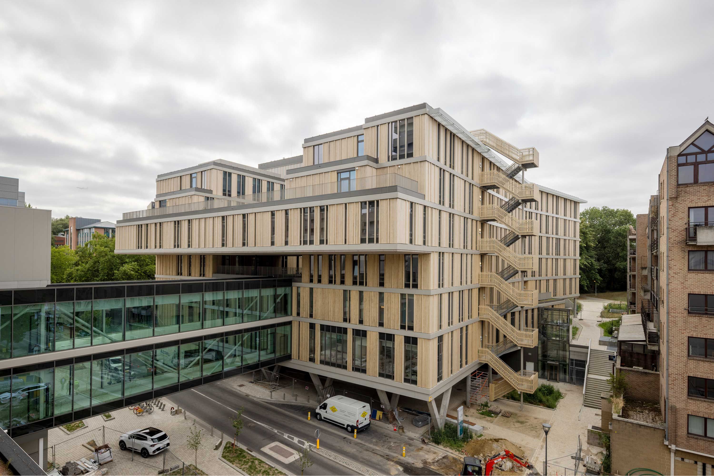 Jusqu’au 1er septembre 2025, les différents services d’oncologie et d’hématologie de l’Institut Roi Albert II (IRA2) étaient répartis sur plusieurs sites au sein des Cliniques universitaires Saint-Luc à Bruxelles. Dans un objectif d’amélioration de l’efficacité organisationnelle, de renforcement des synergies entre les équipes médicales et soignantes, ainsi que d’optimisation de l’accueil et du parcours des patients, il a été décidé de regrouper l’ensemble de ces activités au sein d’un bâtiment neuf, implanté au cœur du campus vert de l’UCL à Woluwe.