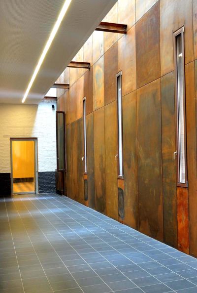 L’implantation et la volumétrie sont conservées, mais le dynamisme des annexes est radicalement modifié. Grâce à l’esthétisme de cet acier pré-patiné, le bâtiment apparait plus chaleureux et accueillant. Sur la structure portante, constituée de maçonnerie, a été placé un chevronnage bois ainsi que l’isolation. C’est sur un contre lattage métallique qu’ont été vissés les modules d’acier de 120 cm de haut et de largeur variable. <br>