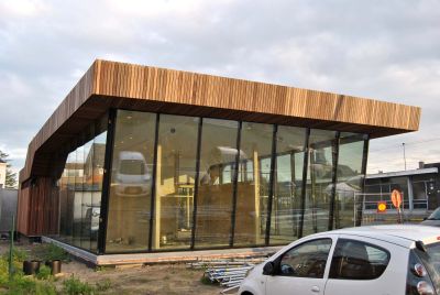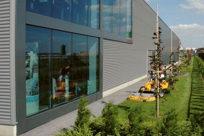 Les façades métalliques du showroom sont combinées avec un mur rideau vitré sur une structure acier. <br>