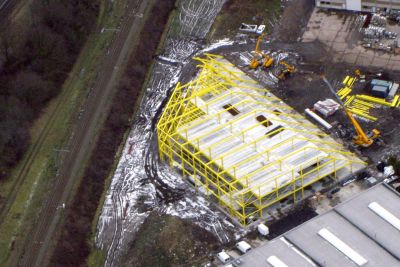 Les constructions en acier répondent à une organisation à la pointe du progrès, largement automatisée et évolutive. La surface bâtie de 33.000 m2 est couverte par des charpentes en treillis. Ces structures en acier S235 et S355 reposent principalement sur des colonnes monolithes ou des poutrelles HEB 220. Côté accès, le complexe se signale par un hall proéminent à ossature métallique. <br>