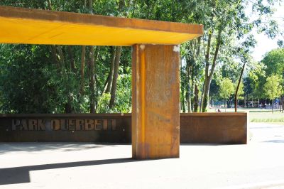 Le souci d’intégration au contexte a plaidé en faveur d’une structure minimale et légère. Quatre poteaux métalliques tubulaires de teinte jaune, rouge, bleu et vert supportent une membrane tendue translucide. Des tirants en inox assurent également la reprise des charges tandis que les blocs dans lesquels ils sont ancrés ont été aménagés en bancs.</p>