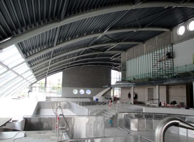 Tekst: <p>La nouvelle piscine de Maaseik est adjacente au complexe sportif existant. Elle comporte une pataugeoire, une piscine récréative, un bassin de compétition et un bassin avec deux toboggans aquatiques, ainsi qu’une cafétéria avec terrasse extérieure. La structure du toit en acier accroche le regard. Elle est constituée de profilés tubulaires courbes en acier. Le choix de l’acier a permis de réaliser ces fermes courbes avec un minimum de colonnes. Les profilés tubulaires en acier ont été dotés sur leur partie supérieure d’un profilé en T soudé afin de fixer le steeldeck. Les profilés tubulaires reposent sur des colonnes en béton auxquelles elles sont fixées par un assemblage de tenons et mortaises. Pour la travée la plus importante (35 m), les profilés tubulaires ont été scindés en deux parties et assemblés par un système tenon et mortaise articulé.