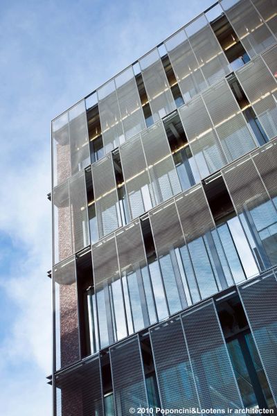 Tekst: <p>L’immeuble d’origine, une construction traditionnelle des années 1960, était devenu obsolète et demandait une rénovation profonde pour répondre aux nouvelles demandes des utilisateurs. La structure de l’immeuble est mise à nu. Les trumeaux décoratifs de façade sont tous supprimés pour offrir une vue panoramique sur le parc royal et tout le sud de Bruxelles. L’ancienne façade en pierres agrafées et en châssis d’aluminium, non isolée, fait place à une nouvelle façade en bois largement vitrée et équipée de stores pare-soleil orientables à lamelles de bambou. Un rideau de ventelles de verre encadrées d’acier inoxydable protège de la pluie le bois des étages +1 à +5 et se complète par un auvent vitré continu à l’étage +6. Au rez-de-chaussée, ainsi que sur l’angle des deux façades à rue et au droit des murs mitoyens, la protection du rideau de ventelles s’interrompt et la façade s’habille d’acier inoxydable.