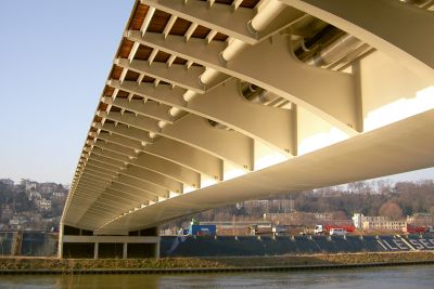 Tekst: <p>Pour la structure portante du nouveau pont de Melle, d’une portée totale de 51 m, le choix s’est porté sur un pont en arc d’une largeur de 8,20 m et d’un poids de 115 tonnes d’acier. Le rayon de courbure de l’arc est de 7,50 m ; l’arc est relié au tablier au moyen de 11 barres rondes. Le pont a été testé suivant les normes EN actuelles aussi bien pour l’état limite ultime que pour l’état limite de service.<br>