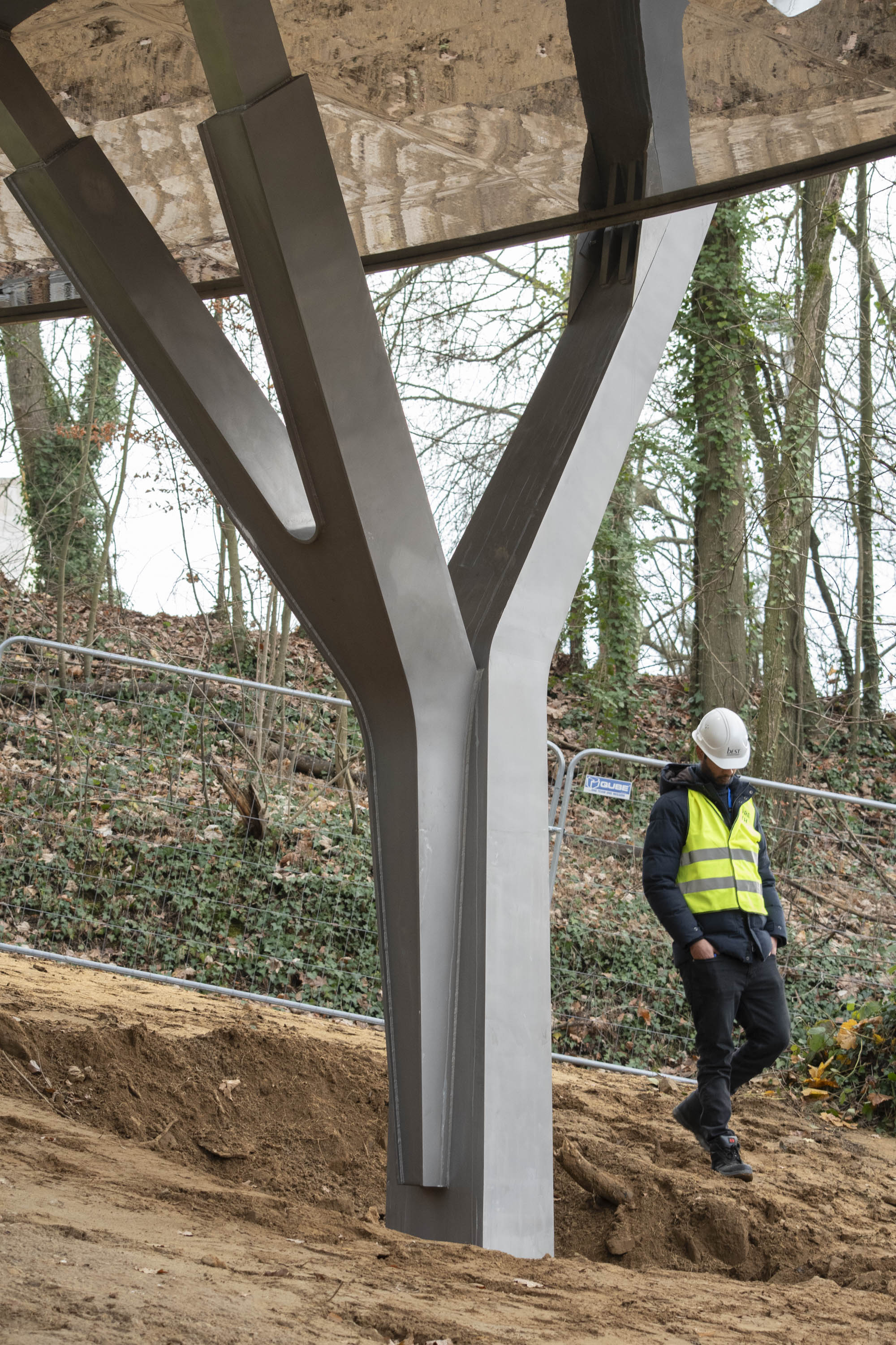 L’implantation de l’ouvrage en plan et élévation est prévue pour préserver un maximum d’arbres existants. Le nombre limité de piles a permis de réduire l’impact au sol de l’ouvrage sur la forêt et dans la clairière.