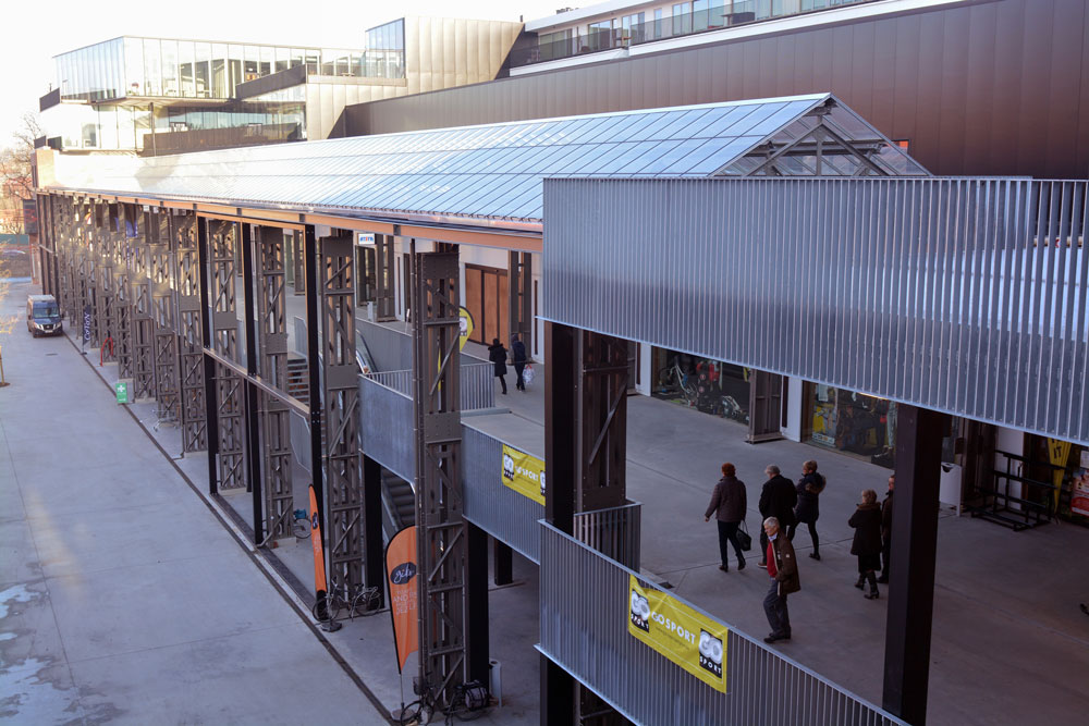 De oude staalstructuur (langs de lange zijde) werd afgebroken, gereinigd, gemetalliseerd en gelakt, om hergebruikt te worden als gaanderij voor het winkelcentrum.  Waar nodig werden nieuwe profielen gemaakt en toegevoegd, met de oude structuur in het achterhoofd. Deze bestaande structuur draagt in dit concept enkel het glazen dak. De betonplaten op het 1e verdiep die de gaanderij vormen, worden door een aparte structuur ondersteund.
