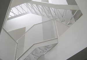 De centrale trap in de vide is een ruimtebepalend element in de woning en verbindt de verschillende leefruimtes. Hij is fijn gedetailleerd. Trapbomen en tredes zijn als gelaste en geprefabriceerde elementen op de werf gebracht te zijn en vervolgens gebout tegen de hoofdstructuur. Het geheel oogt uiterst licht en transparant.