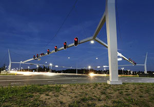 The devil is in the details. Deze ogenschijnlijke eenvoudige structuur werd omwille van het transport en het thermisch verzinken opgeknipt in kleinere delen. Die delen zijn onderling verbonden door middel van blinde boutverbindingen. Deze zijn bovendien minutieus uitgewerkt in functie van een correcte verzinking, met het oog op een lange levensduur en beperkt onderhoud. Alle technische voorzieningen voor de verkeerslichten werden mooi geïntegreerd in de profielen. Dit is een mooi staaltje van ingenieurskunst. Zowel het louter structurele concept als de uitwerking van de verschillende knopen en verbindingen worden zeer gewaardeerd.