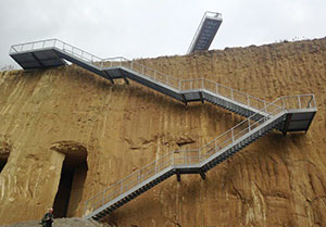 Het project omvat een trappartij die slingert langs de rotspartijen en culmineert in een fantastisch plateau met uitzicht op de groeve. Natuur wordt structuur en structuur biedt een zicht op de natuur. Het is een zeer krachtig gebaar, no nonsense in aanpak. Verzinkt staal is een geslaagde keuze voor de structuurelementen. Enerzijds draagt het bij tot het robuuste en stoere karakter van de constructie, anderzijds is het een uitstekende keuze voor deze grote structuurelementen die toegepast worden in buitenomstandigheden waarbij het ‘zelfhelend effect’ van de zinklaag essentieel is