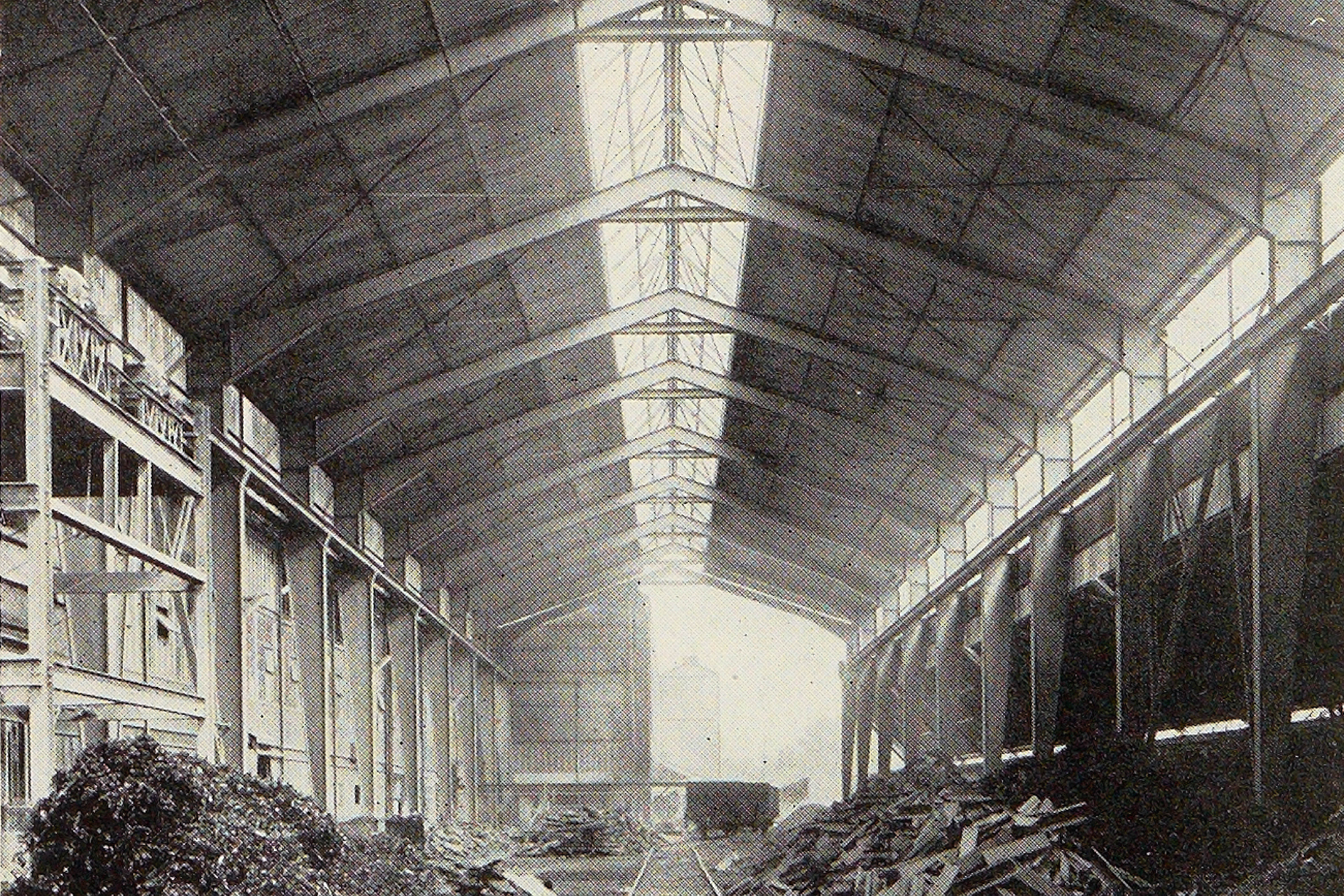 De nieuwe schroothal, gebouwd voor S. A. des Usines Emile Henricot in Court-Saint-Etienne werd gebouwd volgens een ontwerp dat gewoonlijk niet wordt toegepast in een industriële hal van dit type: draagbalken met massieve kern (lijf). De volledig gelaste constructie, zowel in de werkplaats als tijdens de montage, van de spanten gemaakt van A.37SC staal, maakte het mogelijk om ze aanzienlijk te verlichten, terwijl de hele structuur maximale stijfheid kreeg. Vanuit esthetisch oogpunt valt niet te ontkennen dat het ontwerp bijzonder overzichtelijk en een lust voor het oog is.