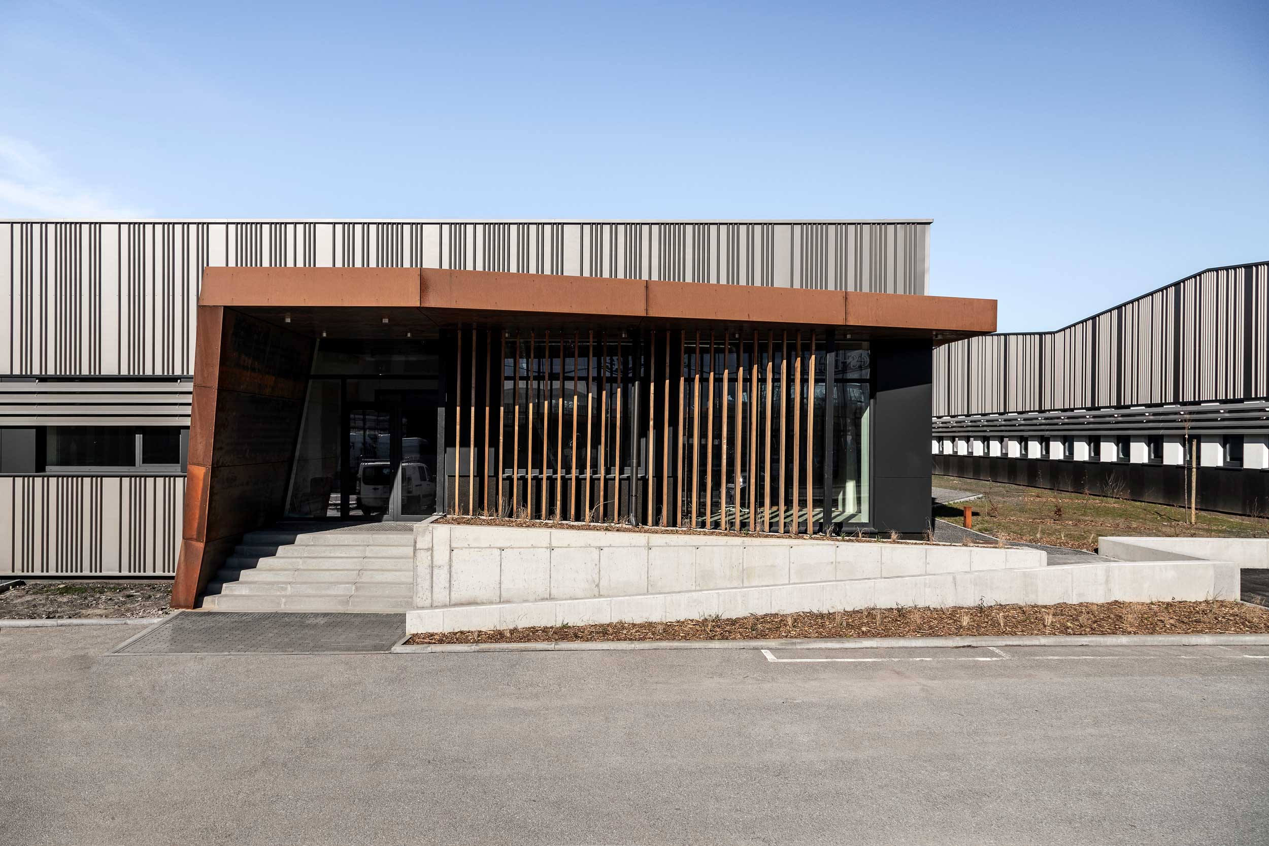 Een gebouw van een voormalig automobielbedrijf omvormen tot een polyvalent industriepark, aangepast aan de activiteiten van start-ups die zich toespitsen op de automatisering van drones: dat was de opdracht van Draft & Project Architectures in het kader van het Diginnov-project in Nijvel. Het ontwerpteam realiseerde een nieuw, energie-efficiënt complex en gaf het tegelijkertijd een markante identiteit, onder meer via het terugkerende gebruik van cortenstaal op verschillende strategische punten in het gebouw.