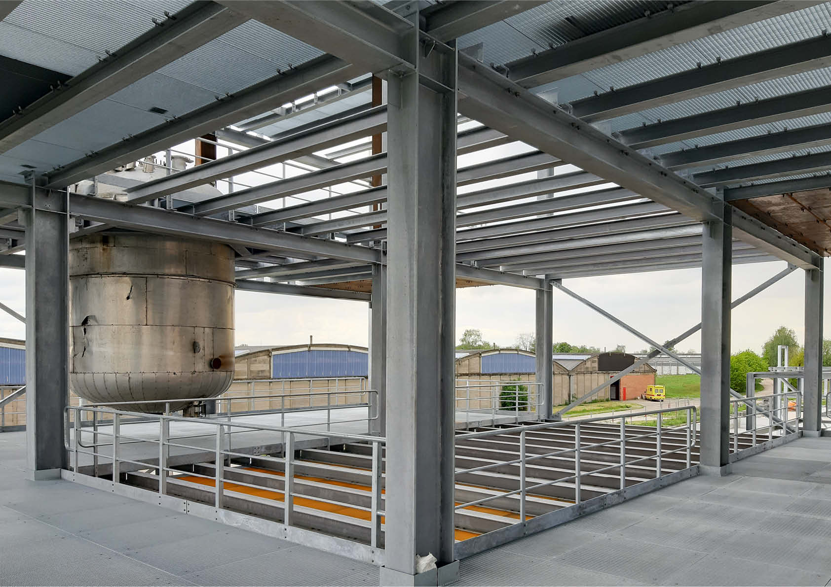 Om rechtstreeks contact tussen de vlammen en de constructie te verhinderen, werden de kritieke kolommen bekleed met beschermingspanelen van 5 mm dik weervast staal. In totaal werd zo’n 250 ton verzinkt staal gebruikt voor het nieuwe oefencomplex, circa 1100 m2 aan roostervloeren en 320 m2 aan beschermingspanelen van cortenstaal.