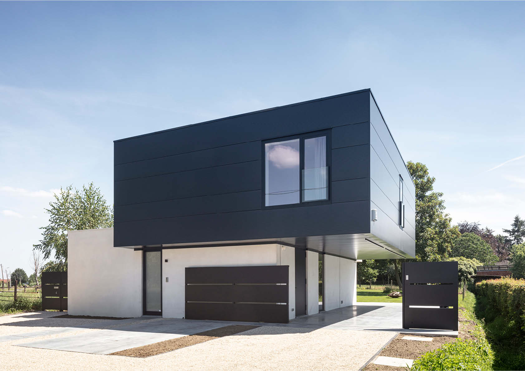 De bouwvorm van deze vrijstaande woning in het Waaslandse groen is met wat verbeelding te omschrijven als twee over elkaar geschoven blokjes, alsof ze samen een duet zingen. Twee rechtgeaarde volumes, twee identiteiten die een beeldende spanning opleveren (beton versus staal). De stalen draagstructuur – gestraald en geschilderd in lasprimer en grondverf – is opgevat als een skelet van warmgewalste profielen (circa 15 ton S235-staal).