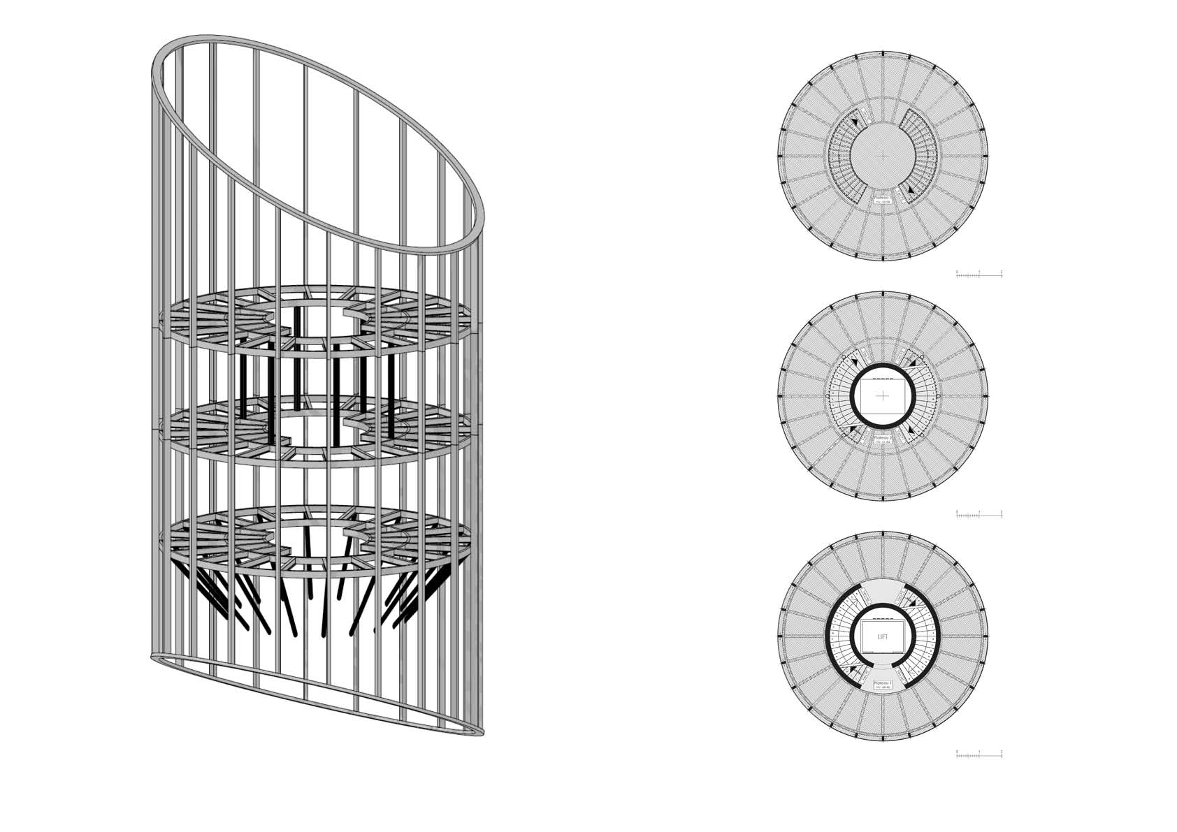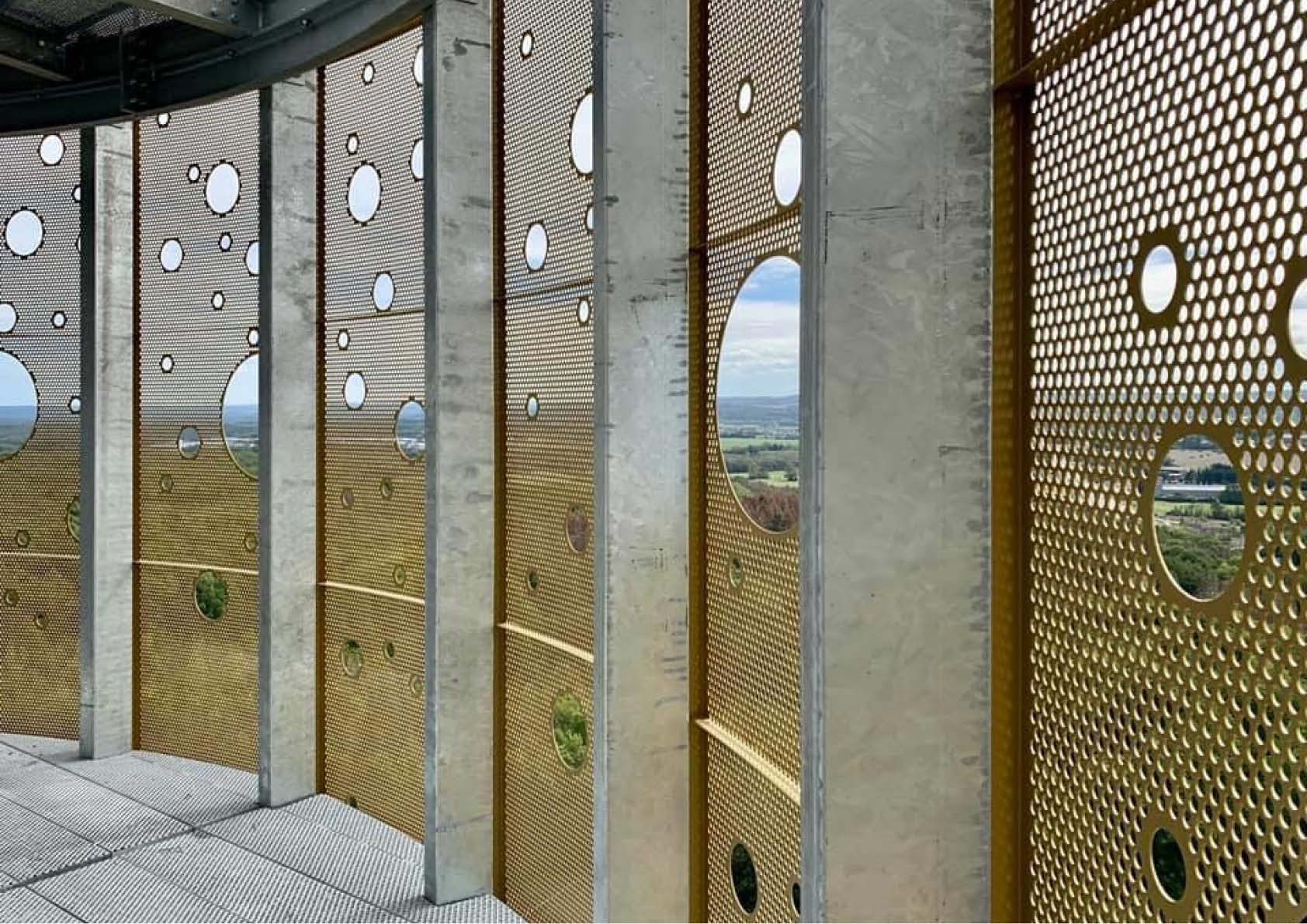 Als dubbelwandige gevel zorgt de geperforeerde beplating voor semitransparantie en een fysieke barrière die hoogtevrees tegengaat en eveneens fungeert als borstwering. De cirkelvormige perforaties met verschillende diameters creëren een wisselend visueel effect en bieden een uitzicht op specifieke delen van de horizon.