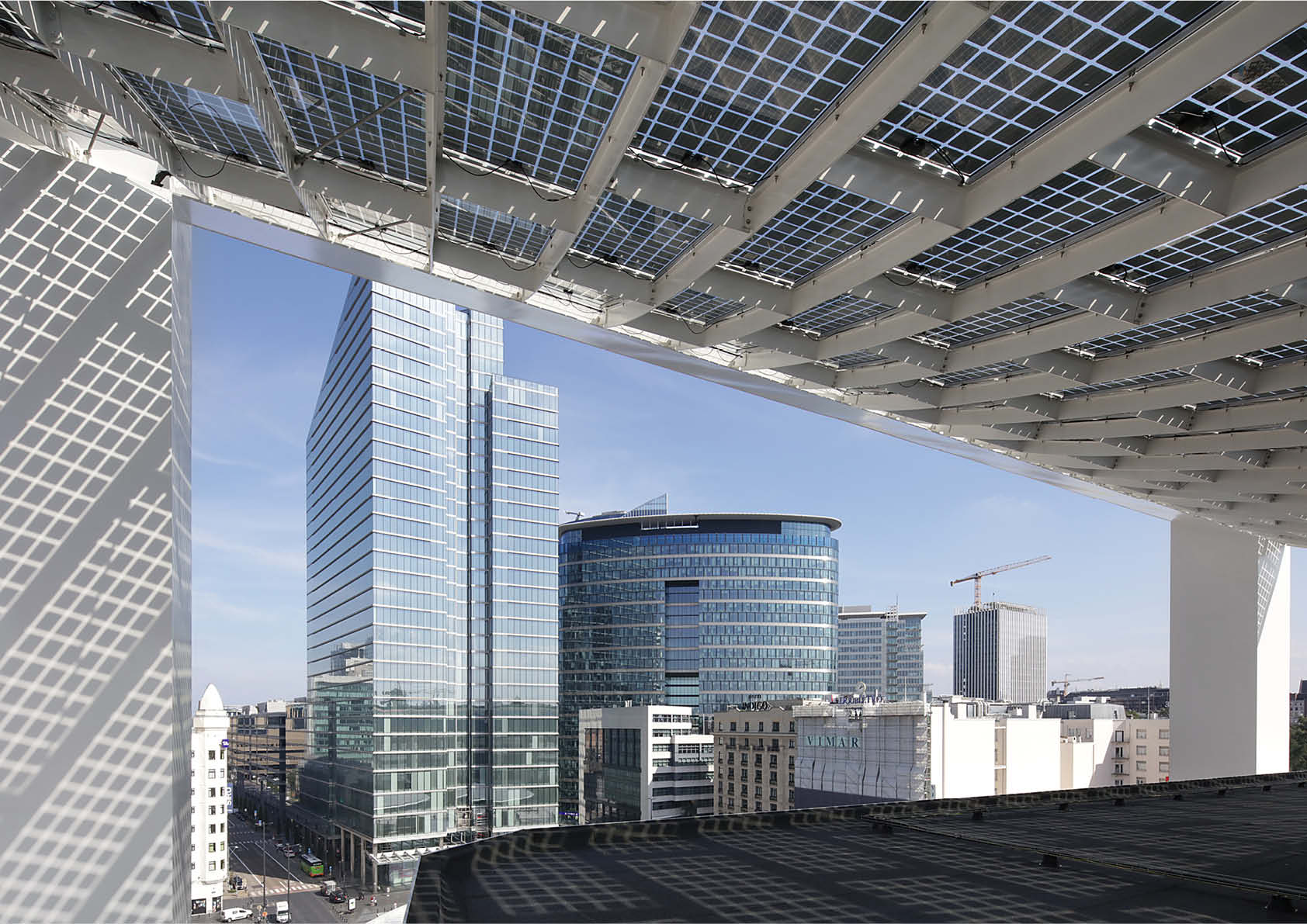 Sinds kort prijkt de Bota Solar-luifel bovenop een gerenoveerd kantoorgebouw uit de jaren 70 in het hartje van Brussel. Hij wekt zonne-energie op en filtert zonnestralen.
