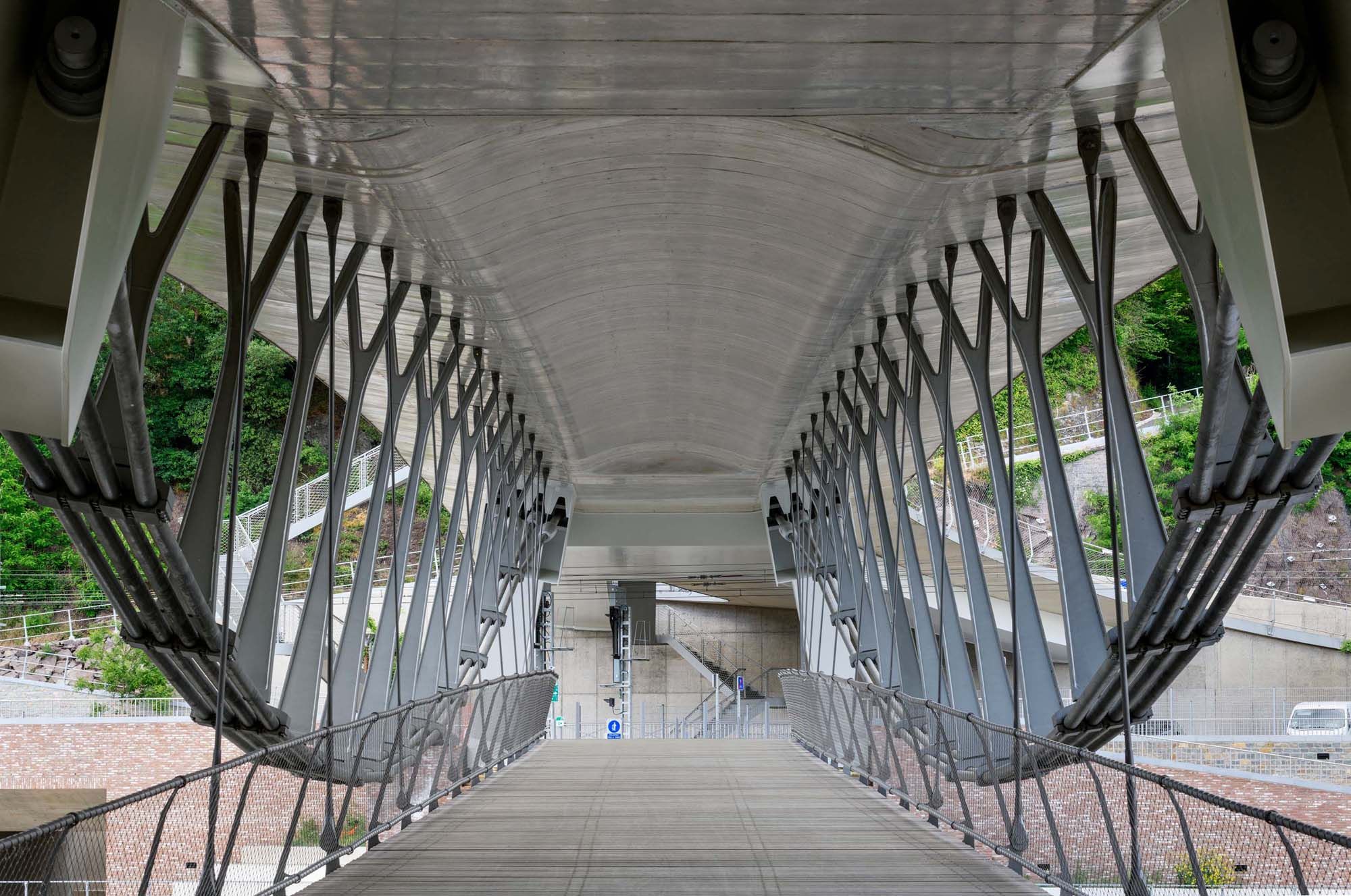 De loopbrug is opgehangen aan het brugdek met stalen staven met schroefdraad (M30 en M42). Ze varieert in breedte van 7 m bij de steunen tot 4 m in het midden van de overspanning en is bekleed met een Azobé-houten beplanking.