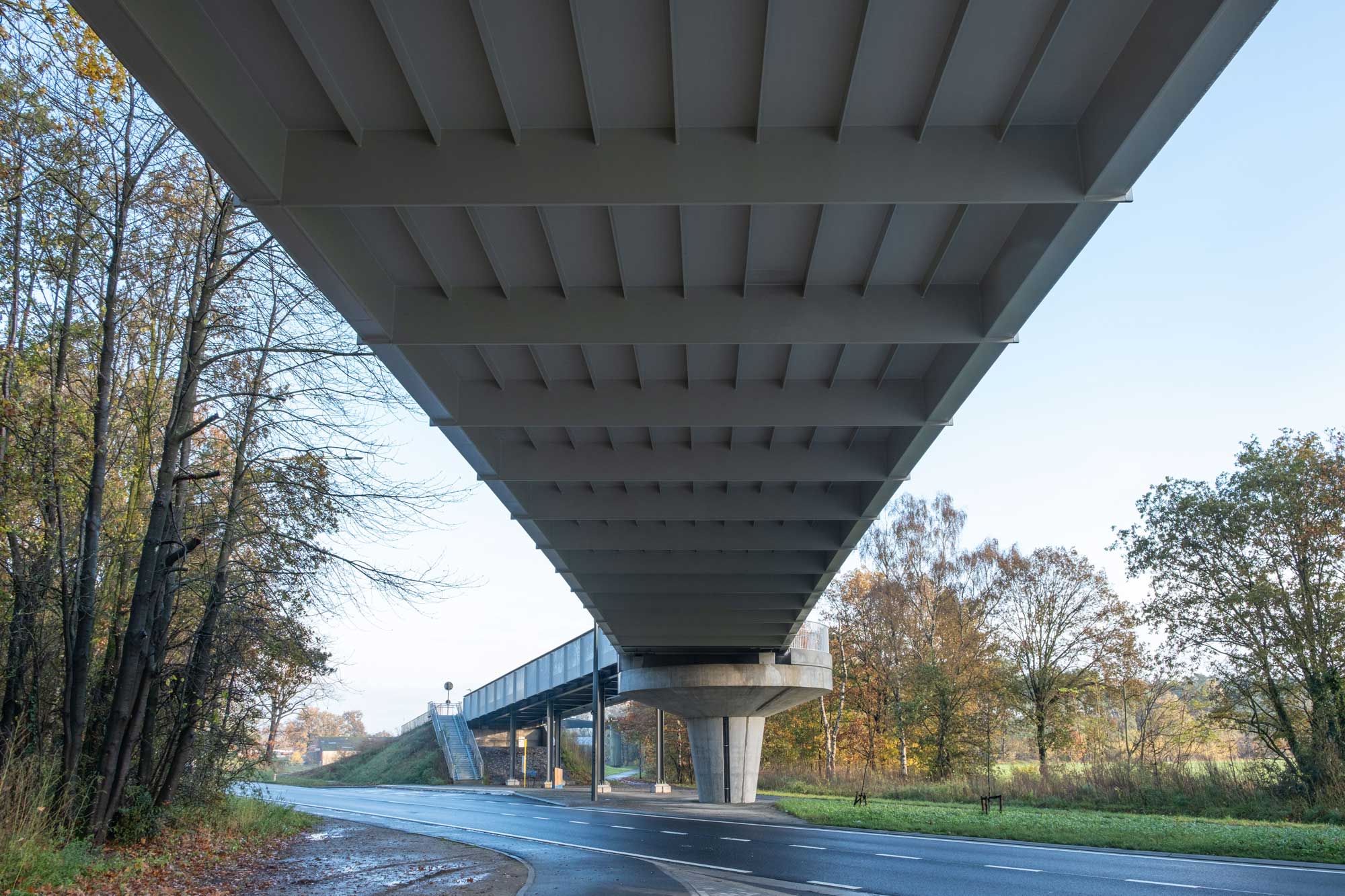 De fietsbrug in Helchteren in Belgisch Limburg, geopend in 2023, vormt een veilige en duurzame verbinding over de N715 tussen de Kievitwijk en de kmo-zone. Als onderdeel van de fietssnelweg F74 biedt ze een comfortabele oversteek voor fietsers en voetgangers. Het ontwerp van de brug is zowel functioneel als landschappelijk geïntegreerd. Aan de westzijde leidt een licht hellende aanbrug fietsers en wandelaars tussen de kruinen van volwassen zomereiken omhoog. Deze natuurlijke inpassing zorgt voor een aangename beleving van het omliggende groen. Bovenop de brug bevindt zich een rustpunt met zitgelegenheid, waar gebruikers kunnen pauzeren en genieten van het uitzicht richting het natuurgebied Molenheide. Aan de oostzijde sluit de brug aan op een robuuste stalen structuur die visueel aansluit bij de industriële context van de kmo-zone. Deze hoekverdraaiing biedt eveneens een plek om even stil te staan bij het landschap. De brug is ontworpen met aandacht voor multimodaliteit. Ze sluit aan op vernieuwde bushaltes, veilige oversteekplaatsen en een heraangelegd fiets- en voetpadennetwerk. Hierdoor ontstaat een knooppunt waar verschillende vervoersmodi samenkomen, wat bijdraagt aan de 'modal shift' richting duurzame verplaatsingen. De brug is bovendien volledig toegankelijk voor personen met beperkte mobiliteit, dankzij de geleidelijke hellingsgraad en de brede, overzichtelijke paden.