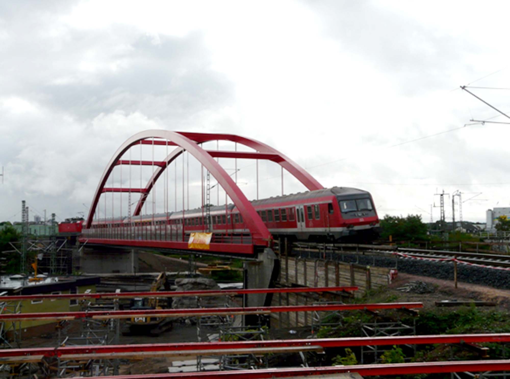 De van 1925 daterende spoorwegbrug ter hoogte van het Galluspark te Frankfurt moest worden vervangen, waarbij de ligging en de overspanning aangepast werden.