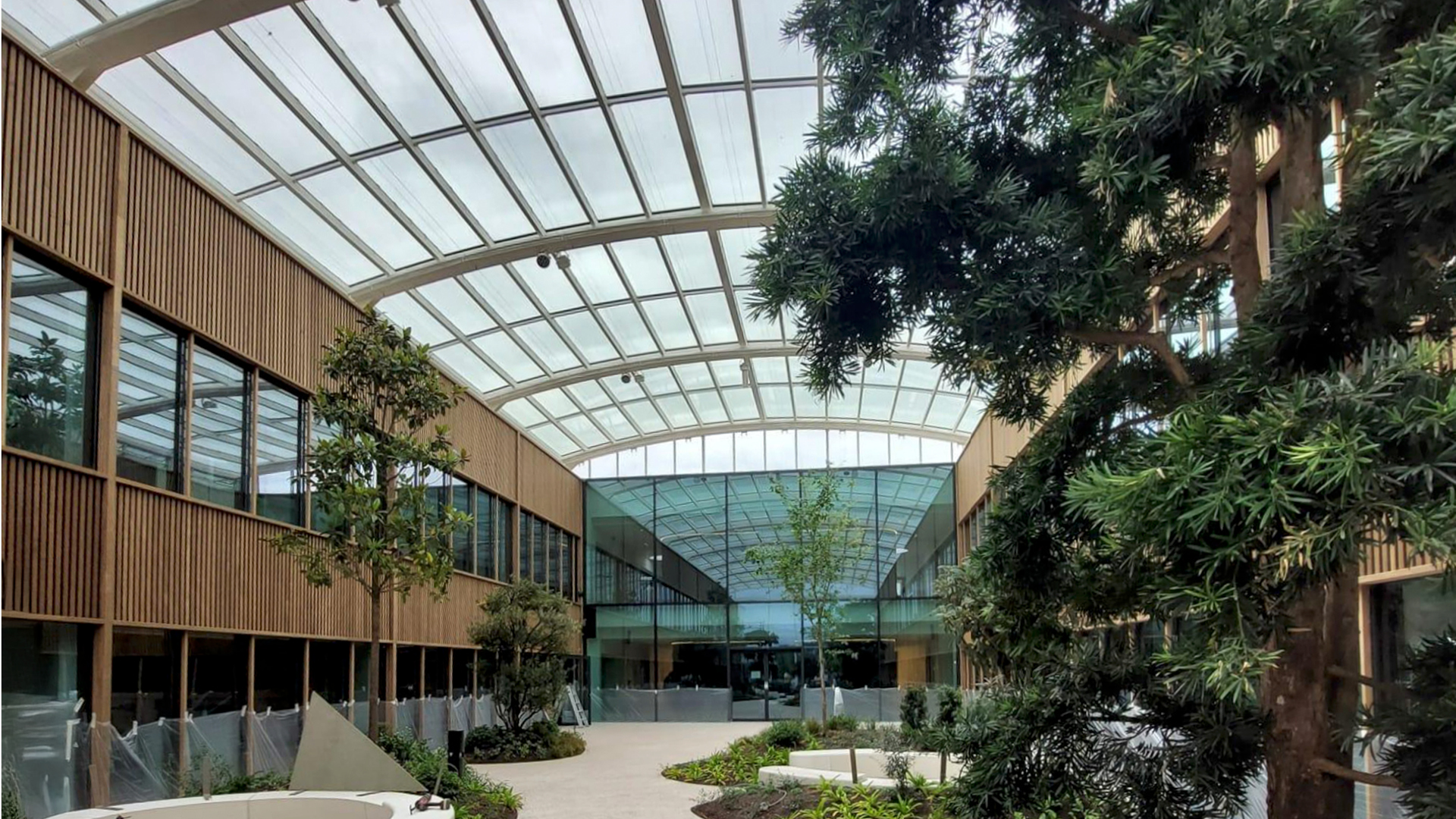 Het glasdak bestaat uit boogspanten die 12 m overbruggen. Deze worden om de 6 m geplaatst en worden met stalen gordingen verbonden. Hierop komt een aluminium grid die het dubbel glas opvangt. De boogspanten zitten 1 m hoger dan het dakopstand. Die meter wordt ingevuld met een geautomatiseerde lamellengevel in glas voor de ventilatie.